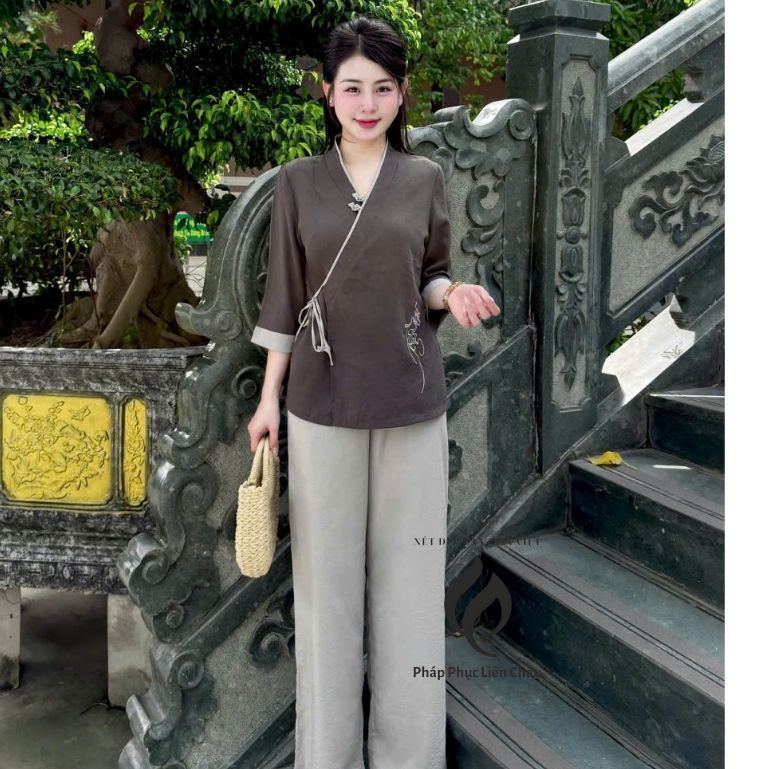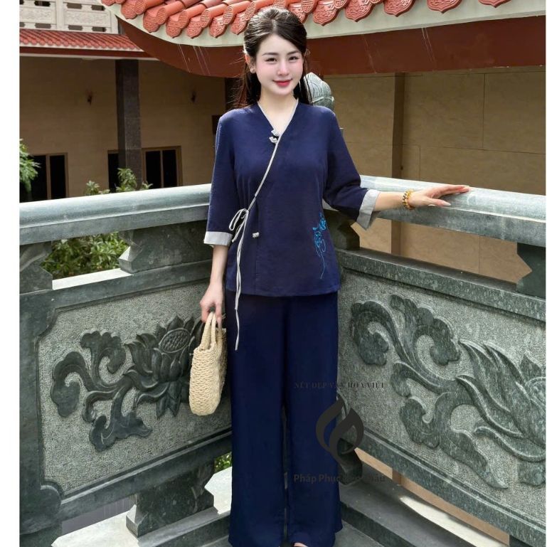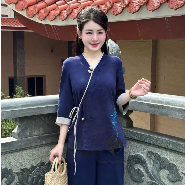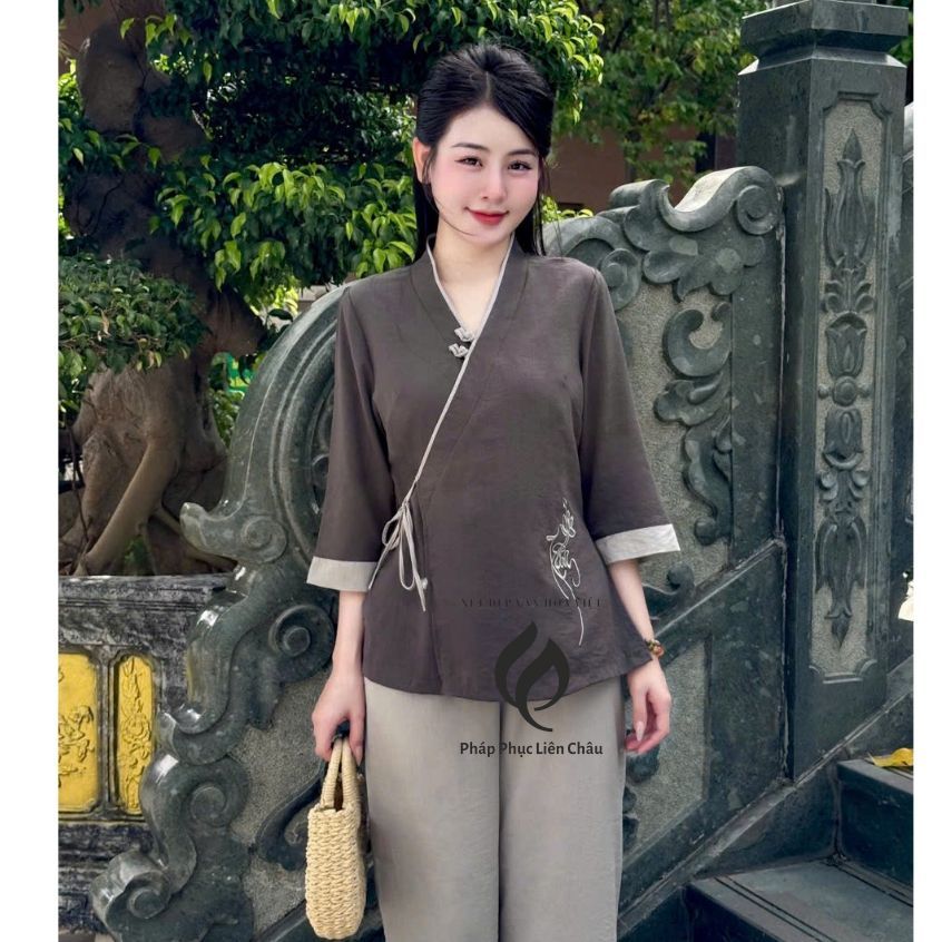BỘ ĐŨI SEN TÂM – Đồ Lam Nữ Truyền Thống Vải Đũi Thêu Tỉ Mỉ – Vạt Chéo Tinh Tế – Pháp Phục Liên Châu – Silk