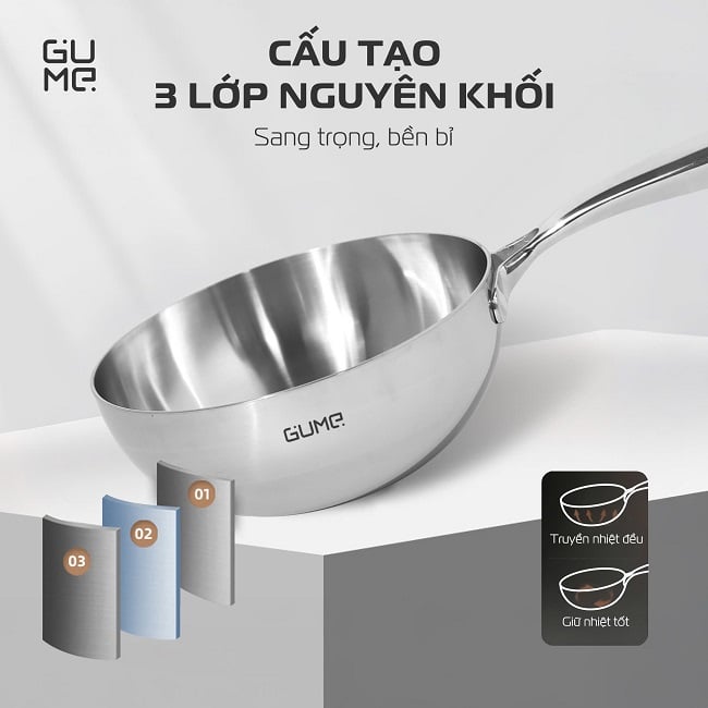 “Điểm ăn tiền” làm nên tên tuổi của chảo chống dính sâu lòng GM-W1520 chính là cấu tạo 3 lớp nguyên khối, loại bỏ hoàn toàn các mối hàn. Điều này không chỉ giúp chảo có độ bền vượt trội, tránh hiện tượng rò rỉ hay nứt gãy sau thời gian dài sử dụng, mà còn đảm bảo an toàn vệ sinh tối đa.
