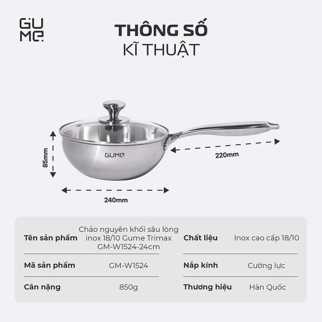 Thông số kỹ thuật chảo inox 18/10 Gume Trimax GM-W1524