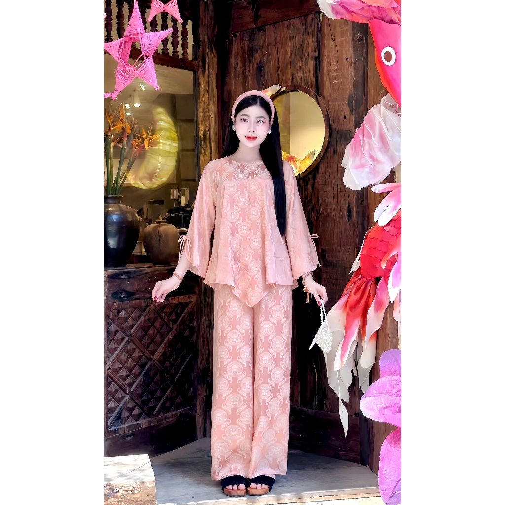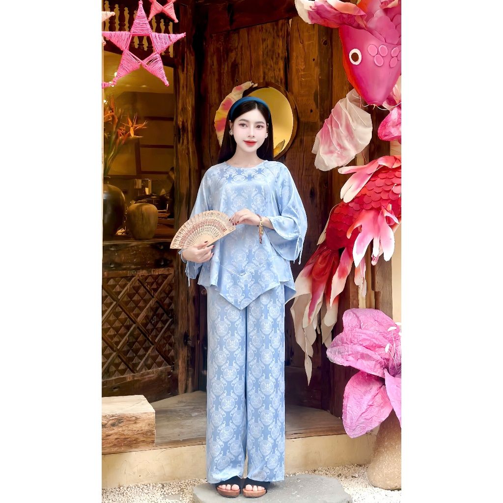 Đồ lam thiết kế vạt chéo tay xòe TINH NHI họa tiết chư thọ sang trọng PP365