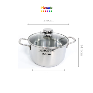– Tên sản phẩm: Nồi Inox 304, 3 Đáy, Nắp Kính, Giá Khuyến Mãi Sâu, Dùng Bếp Từ, Hãng Picook 22cm IN3D22GM