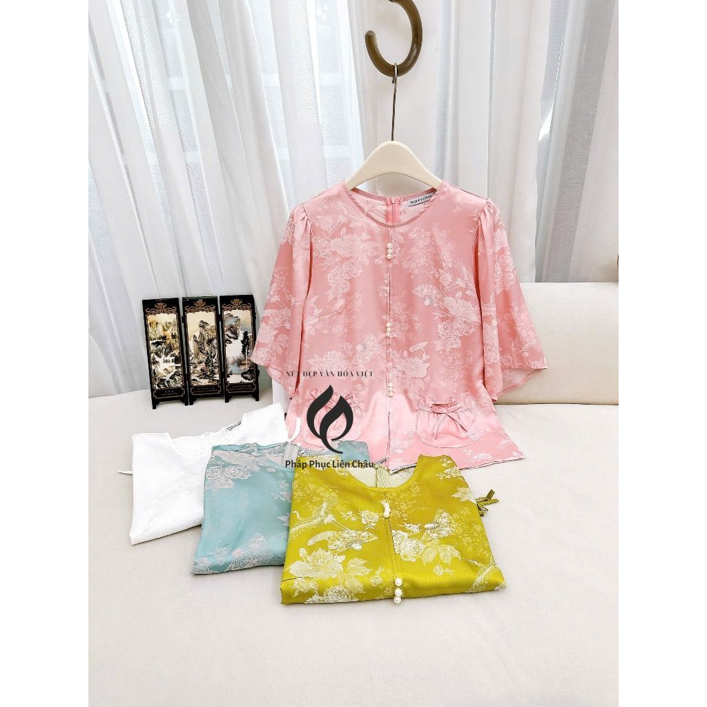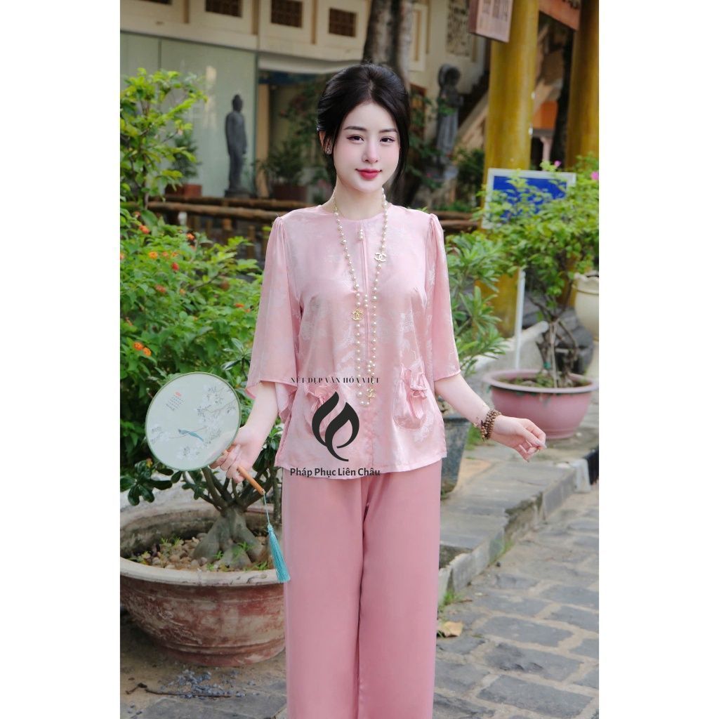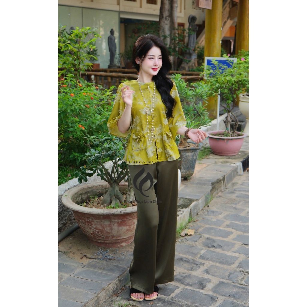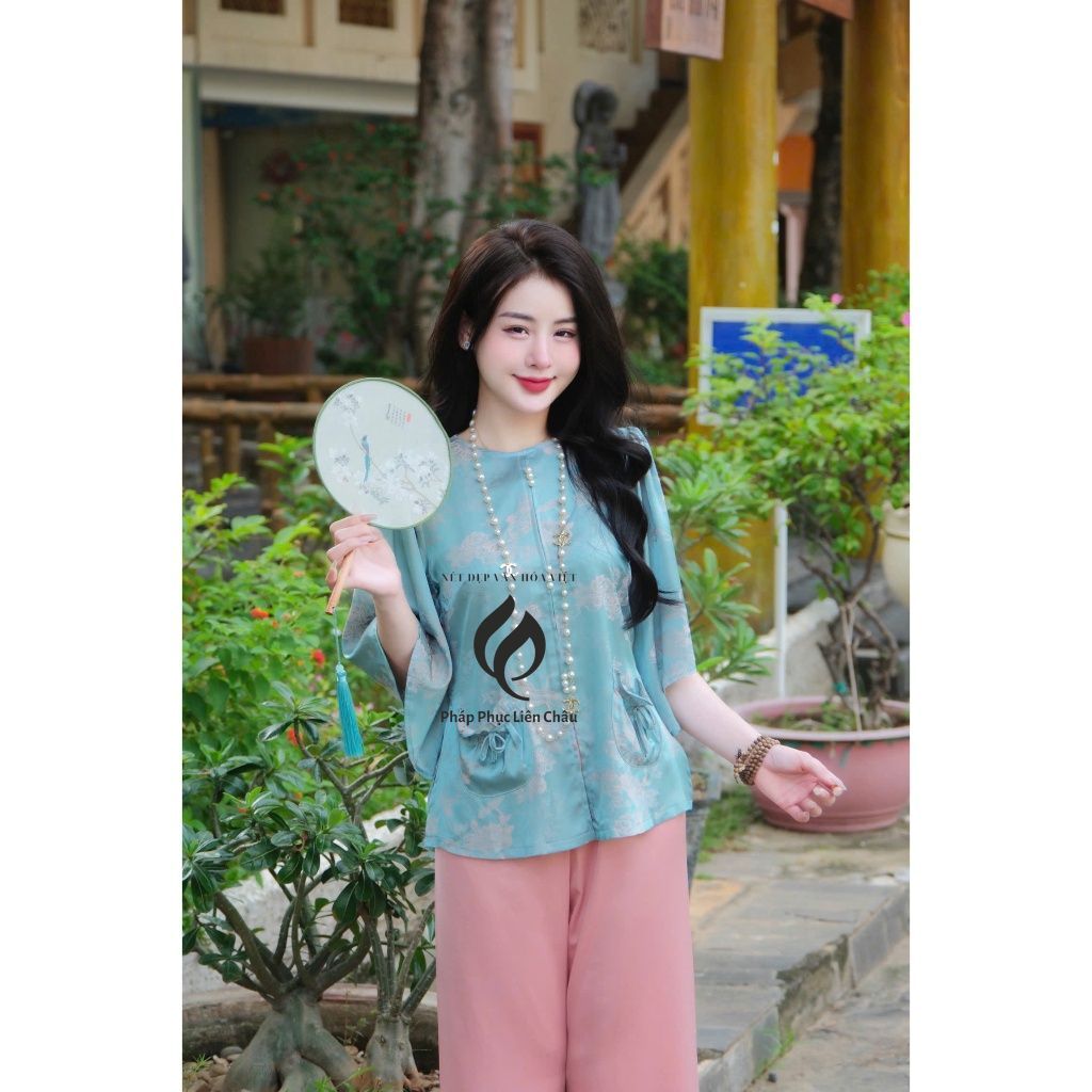 Pháp Phục, Bộ Lam đi chùa cổ tròn chất vải lụa gấm Tô Châu tiểu thư, tay lỡ phối túi tiền cao cấp – Pháp Phục Sài Gòn