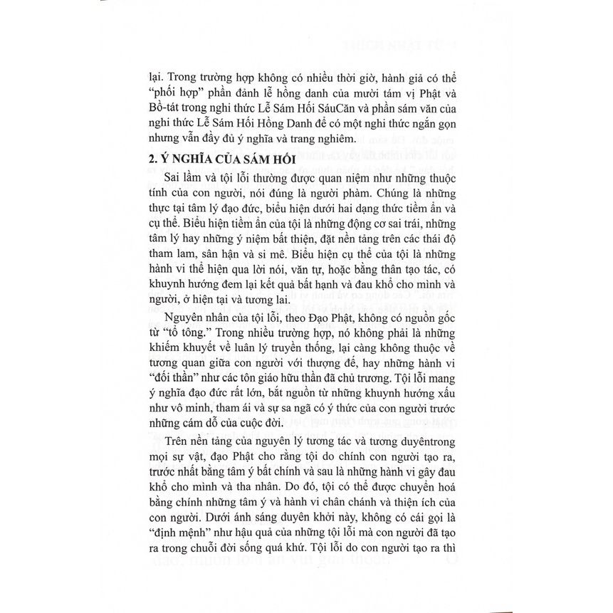 Phần chánh Kinh gồm có 2 nghi thức: Lạy Sám Hối Sáu Căn của vua Trần Thái Tông trong Khoá Hư Lục và Lạy Sám Hối Hồng Danh (Hồng Danh Bửu Sám). Phần đảnh lễ hồng danh của mười tám vị Phật và Bồ Tát trong phần Lạy Sám Hối Sáu Căn do tác giả biên soạn, dung hoà tinh thần Phật giáo Nam tông và Bắc tông.