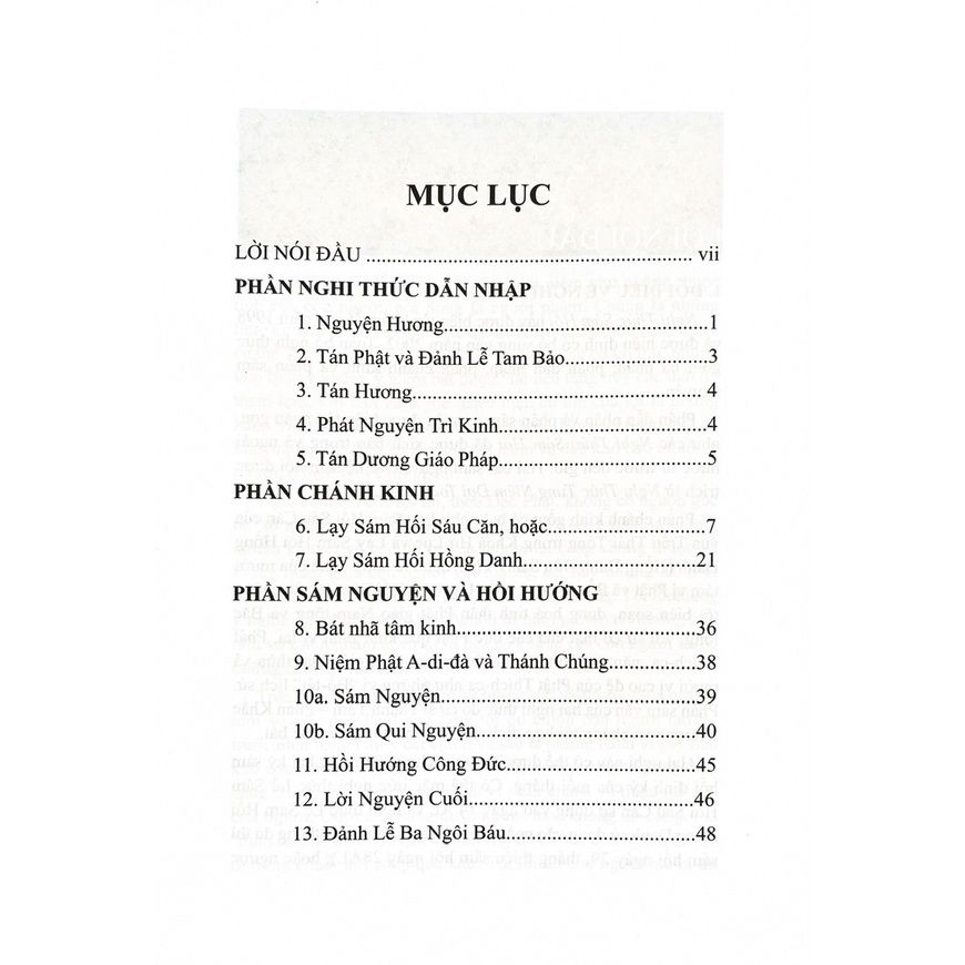 Phần chánh Kinh gồm có 2 nghi thức: Lạy Sám Hối Sáu Căn của vua Trần Thái Tông trong Khoá Hư Lục và Lạy Sám Hối Hồng Danh (Hồng Danh Bửu Sám). Phần đảnh lễ hồng danh của mười tám vị Phật và Bồ Tát trong phần Lạy Sám Hối Sáu Căn do tác giả biên soạn, dung hoà tinh thần Phật giáo Nam tông và Bắc tông.