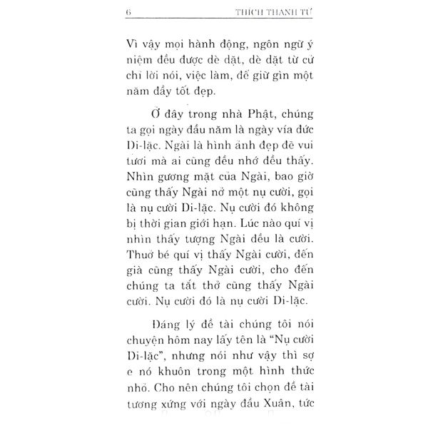 Đức Di Lặc là hình ảnh đẹp đẽ vui tươi mà ai cũng thích. Gương mặt Ngài lúc nào cũng nở nụ cười hoan hỷ gọi là nụ cười Di Lặc. Nụ cười Di Lặc không bị thời gian chi phối, lúc nào Ngài cũng cười; thưở bé cũng thấy Ngài cười, đến già cũng thấy Ngài cười, sắp tắt thở cũng thấy Ngài cười. Đó là nụ cười Di Lặc.