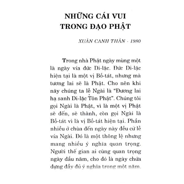 Trong nhà Phật ngày mùng một Tết là ngày vía đức Di Lặc. Đức Di Lặc hiện là Bồ tát, nhưng tương lai sẽ thành Phật. Thế nên lễ Ngài, chúng ta xưng “Đương Lai Hạ Sanh Di Lặc Tôn Phật”. Chúng tôi gọi Ngài là Phật vì Ngài là Phật sẽ thành, còn gọi Ngài là Bồ tát vì Ngài là vị Bồ tát hiện tại. Đa số các chùa thuộc hệ Bắc tông đến ngày mùng một Tết đều cử lễ vía Ngài. Đó là một thông lệ nhưng mang nhiều ý nghĩa quan trọng. Người thế gian ai cũng quan trọng ngày đầu năm, cho ngày đầu năm là ngày chứa đựng đầy đủ ý nghĩa trong một năm. Vì vậy mọi hành động, mọi ngôn ngữ, mọi ý nghĩ đều được dè dặt để giữ gìn một năm đầy tốt đẹp.
