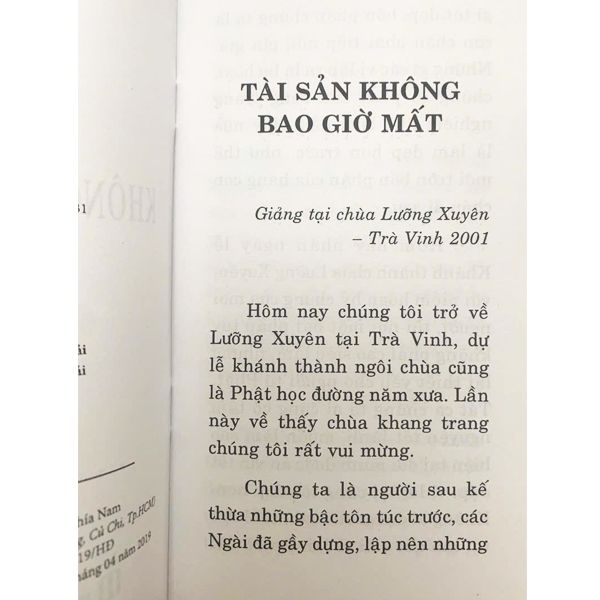 Chúng tôi viết quyển sách Tài Sản Không Bao Giờ Mất này cho những người mới bắt đầu học Phật. Bước đầu tuy tầm thường song không kém phần quan trọng, nếu bước đầu đi sai, những bước sau khó mà đúng được. Người học Phật khi mới vào đạo không hiểu đúng tinh thần Phật giáo, về sau sẽ hỏng cả một đời tu. Người có trách nhiệm hướng dẫn không thể xem thường kẻ mới học, cần phải xây dựng có một căn bản vững chắc, đi đúng đường hướng của Phật dạy. Hiểu Phật giáo một cách đúng đắn, mới mong thành một Phật tử chân chánh. Vì muốn chỉ lẽ chánh tà để người mới vào đạo khỏi lầm lẫn, nên chúng tôi mạnh dạn chỉ thẳng những điều sai lầm hiện có trong Phật giáo. Làm như thế, không có nghĩa chúng tôi muốn vạch lưng chỉ thẹo cho kẻ khác thấy, mà cốt yếu muốn gây dựng lại một nếp sống Phật giáo phù hợp với hiện tại và mai sau.