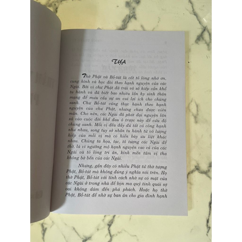Ngài. Bởi vì chư Phật đã trải vô số kiếp cần khổ tu hành và đã biết bao nhiêu lần hy sinh thân mạng để mưu cầu sự an vui lợi ích cho chúng sanh. Chư Bồ-tát cũng thực hành theo hạnh nguyện của chư Phật, nhưng chưa được viên mãn. Cho nên, các Ngài đã phát đại nguyện lăn xả vào cuộc đời khổ đau ô trược này để cứu độ chúng sanh. Mỗi vị đều đầy đủ tất cả công hạnh như nhau, song tuy sở nhân tu hành từ vô lượng kiếp của mỗi vị mà có hiển bày ưu liệt khác nhau. Chúng ta họa, tạc, tô tượng các Ngài để thờ, là vì ngưỡng mộ hạnh nguyện cao cả của các Ngài và tỏ lòng tri ân, kính mến tâm vị tha không bờ bến của các Ngài. Nhưng, gần đây có nhiều Phật tử thờ tượng mà không đúng ý nghĩa nói trên.