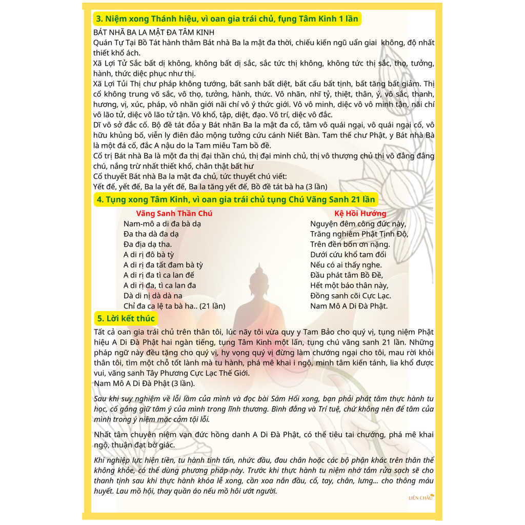 Trước khi thực hành tu niệm nhớ tắm rửa sạch sẽ cho thanh tịnh; Sau khi thực hành khóa lễ xong, cần xoa nắn đầu, cổ, tay, chân, lưng… cho thông máu huyết. Lau mồ hôi, thay quần áo nếu mồ hôi ướt người.